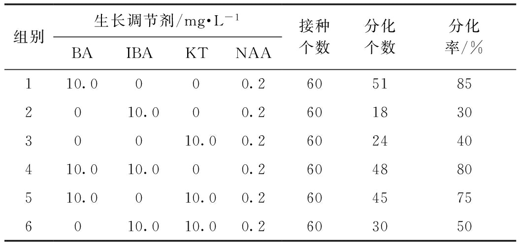 為確定更適合多花黃精分化的生長調(diào)節(jié)劑,比較了BA,IBA,KT在濃度10 mg·L-1時(shí)的分化率,其中保持NAA濃度在0.2 mg·L-1,設(shè)計(jì)了表2的試驗(yàn)方案,每組合接種20個(gè),30 d后觀察統(tǒng)計(jì),重復(fù)三次試驗(yàn)。