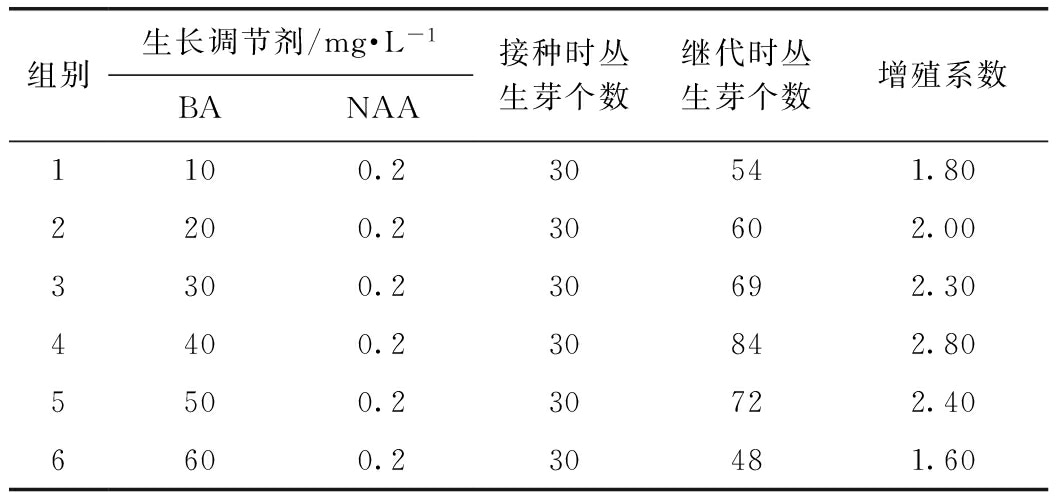 將誘導(dǎo)分化的多花黃精莖尖從誘導(dǎo)分化培養(yǎng)基轉(zhuǎn)移到不同BA激素組合的繼代與增殖的培養(yǎng)基中,確定佳的BA濃度,25±1 ℃,光照1 500 Lx,時(shí)間10 h。