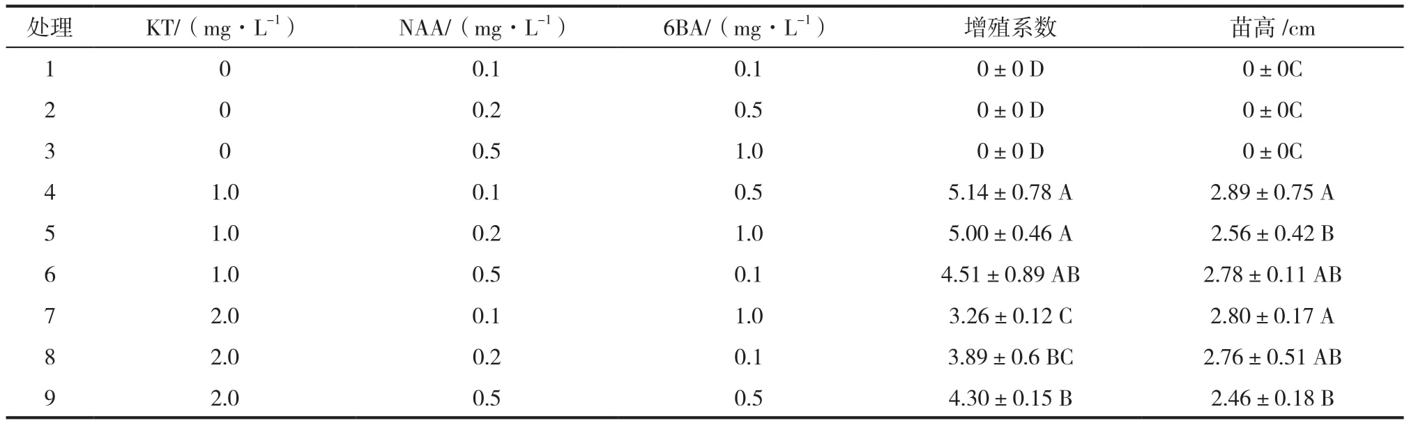 以MS為基本培養(yǎng)基,添加植物生長(zhǎng)調(diào)節(jié)劑KT、NAA和6 BA,KT濃度設(shè)定為0、1.0、2.0 mg/L,NAA濃度設(shè)定為0.1、0.2、0.5 mg/L,6 BA濃度設(shè)定為0.1、0.5、1.0 mg/L。按照正交表 L9( 34) 設(shè)計(jì)成 9 種不同的處理。將誘導(dǎo)的芽單獨(dú)切離下來(lái)接種到培養(yǎng)基上,每個(gè)處理接種30個(gè)芽,分別接種在5個(gè)培養(yǎng)瓶中,每瓶接種6個(gè)芽,重復(fù) 3 次。30 d 后調(diào)查其增殖倍數(shù)和生長(zhǎng)情況。