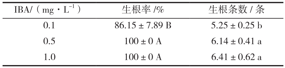 以MS為基本培養(yǎng)基,添加IBA,濃度分別設(shè)定為0.1、0.5、1.0 mg/L,切取2.0 cm左右健壯一致的微枝轉(zhuǎn)接到生根培養(yǎng)基上誘導(dǎo)生根,共3個(gè)處理,每個(gè)處理接種50株,重復(fù)3次,25 d調(diào)查生根率、生根條數(shù)。