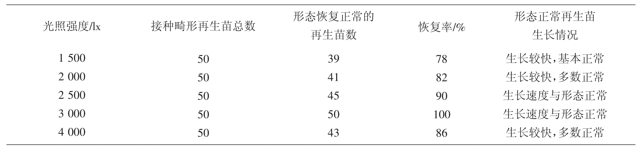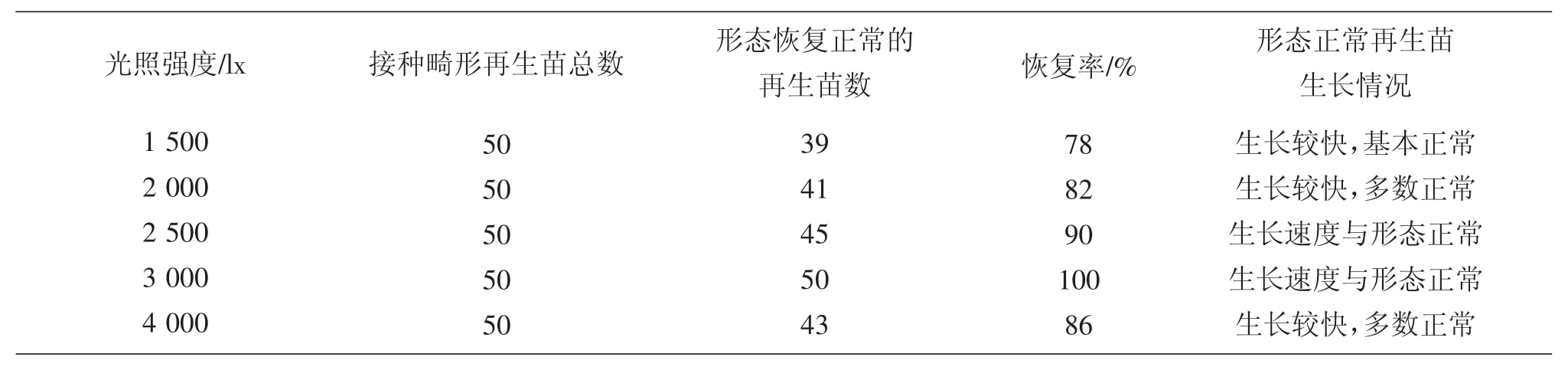 從表2可以看出,冰燈玉露形態(tài)正常率較高,原因主要是由于試驗(yàn)采用的培養(yǎng)基為MS附加0.25 mg·L-1的BA,因此,組培苗形態(tài)普遍變得較為正常;但在不同溫度下,形態(tài)正常苗的比例有所不同,當(dāng)溫度為20℃時(shí),獲得的形態(tài)正常的組培苗數(shù)多,而隨著溫度的增加,組培苗恢復(fù)率也逐漸下降,到28℃時(shí),僅有38%。說明冰燈玉露形態(tài)建成培養(yǎng)的溫度應(yīng)采用較低的溫度。在試驗(yàn)中,也曾采用18℃進(jìn)行培養(yǎng),但結(jié)果顯示,幾乎所有組培苗都停止生長(zhǎng),只有個(gè)別生長(zhǎng)正常,說明過低溫度也不利于冰燈玉露組培苗的形態(tài)建成。雖然在20℃時(shí)可以獲得較高的冰燈玉露組培苗的恢復(fù)率,但也因溫度較低,組培苗生長(zhǎng)速度較慢,也不是理想的培養(yǎng)條件。為此,試驗(yàn)又采用不同光照強(qiáng)度來提高形態(tài)重建率,希望獲得較高、較快的冰燈玉露形態(tài)重建培養(yǎng)。