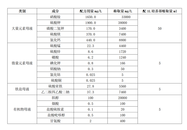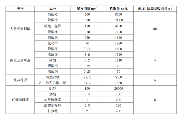 WPM基本培養(yǎng)基母液配制見表